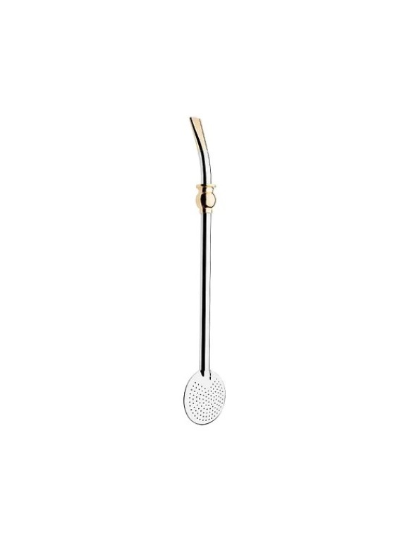 Bomba para chimarrão em aço niquelado com banho de cromo, com um delicado anel em formato de cuia no centro do cano, com banho de ouro. Uma peça para agregar originalidade ao seu chimarrão.